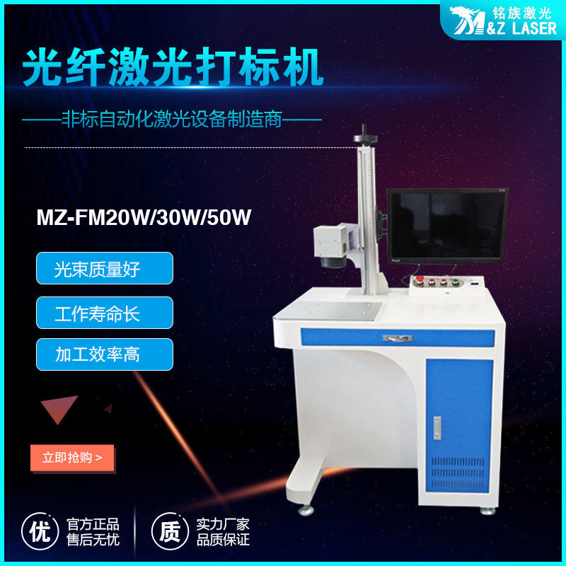 MZ-FM-20/30/50/100W-R光纖激光打標機是我公司運用現(xiàn)今世界上先進的激光技術(shù)研制而成的新一代激光打標機系統(tǒng)。采用武漢銳光纖輸出激光,再經(jīng)高速掃描振鏡系統(tǒng)實現(xiàn)打標功能。光纖激光打標機電光轉(zhuǎn)換效率高,達到30%以上,采用風(fēng)冷方式冷卻,整機體積小巧,輸出光束質(zhì)量好,可靠性高??傻窨探饘俨牧虾筒糠址墙饘俨牧?,主要應(yīng)用于對深度、光滑度、精細度要求較高的領(lǐng)域,如鐘表、首飾、模具行業(yè),位圖打標等。